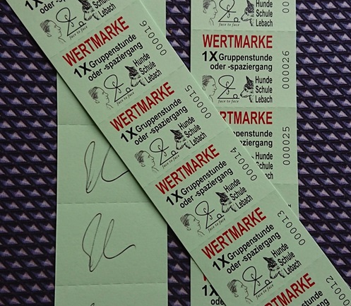 Die Zehnerkarten bestehen aus 10 einzelnen Wertmarken. Jede davon ist eindeutig nummeriert und auf der Rückseite von mir abgezeichnet. Diese können dann im Training vor Ort einfach als Zahlungsmittel verwendet werden.